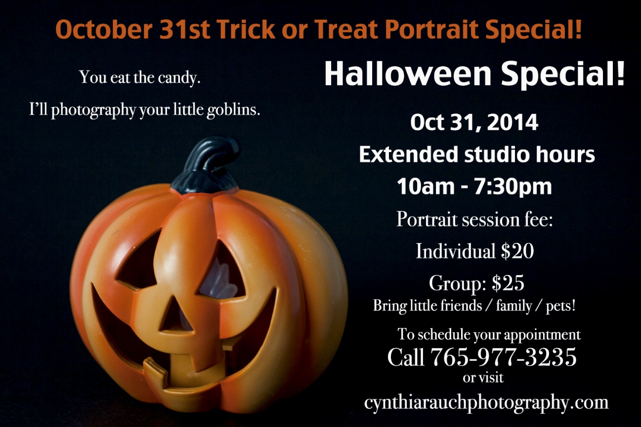It's a Halloween Portrait Special!  Bring your children or goblin's to the studio for a portrait in their Halloween costume. I will have extended hours on Friday so while you are out and about, or anytime that day, stop by the studio.  Call 765-977-3245 to take advantage of this special.